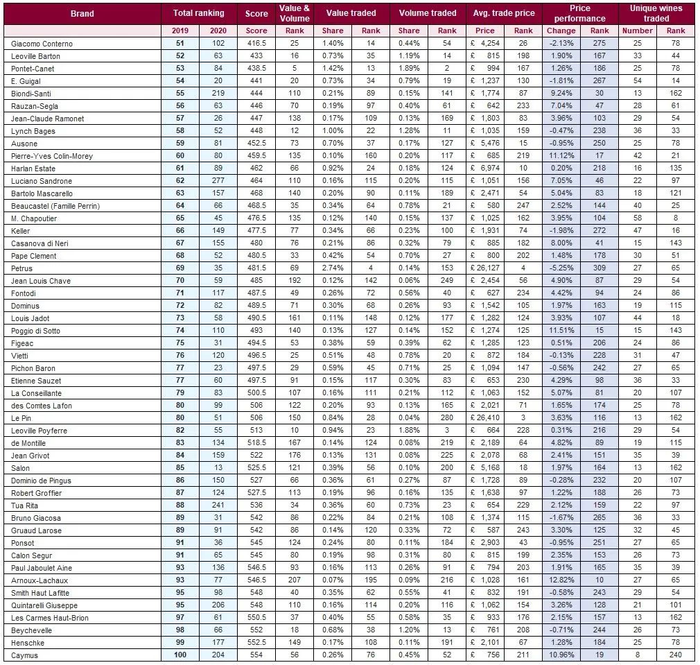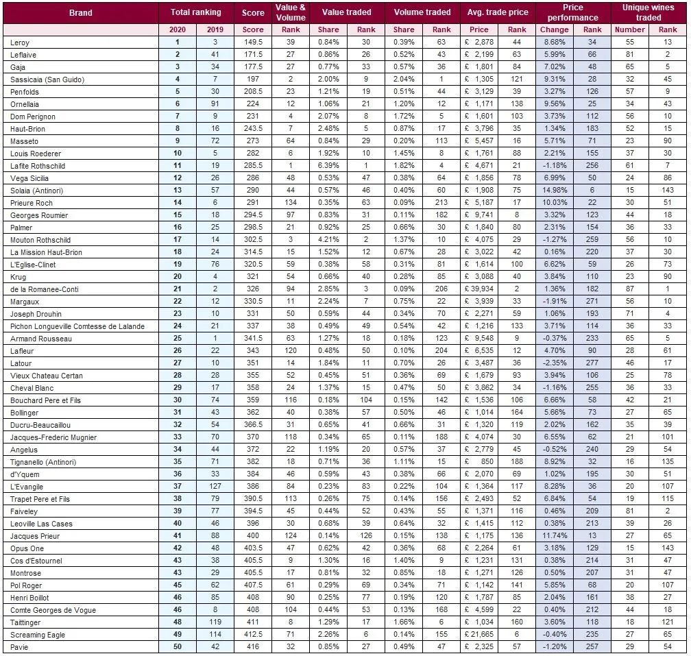 以所有在过去一年(2019年10月1日至2020年9月31 日)在Liv-ex交易的葡萄酒名单为基础,根据四个标准:价格表现(一箱葡萄酒于2019年10月1日至2020年9月30日的市场价格);在Liv-ex的交易表现(交易价值和数量)、出现交易的不同葡萄酒和年份数量以及平均葡萄酒价格,来进行品牌排名。品牌必须符合以下两个条件方有资格入?。?. 最少有三款葡萄酒或年份出现交易;2.交易总值不少于10,000英镑。